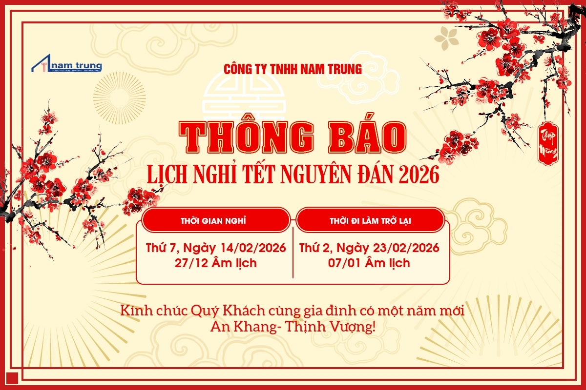 0987 87 5021Công ty TNHH Nam Trung xin gửi lời cảm ơn chân thành đến Quý Khách Hàng và Đối Tác đã đồng hành cùng chúng tôi trong năm vừa qua. Kính gửi đến Quý Khách Hàng và Đối Tác lịch nghỉ Tết Nguyên Đán 2026.